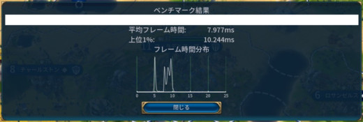 FPS値が分かる。今回のPCでは、平均:125.4FPS ,高負荷時: 97.62FPS